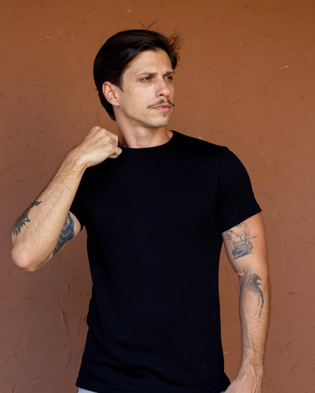 Respirabilidade e Durabilidade Apesar de seu tecido encorpado, a camiseta mantém a respirabilidade necessária para o uso diário, garantindo frescor e conforto mesmo em dias mais quentes. A mistura de poliéster e viscose assegura resistência e facilidade na manutenção da peça.